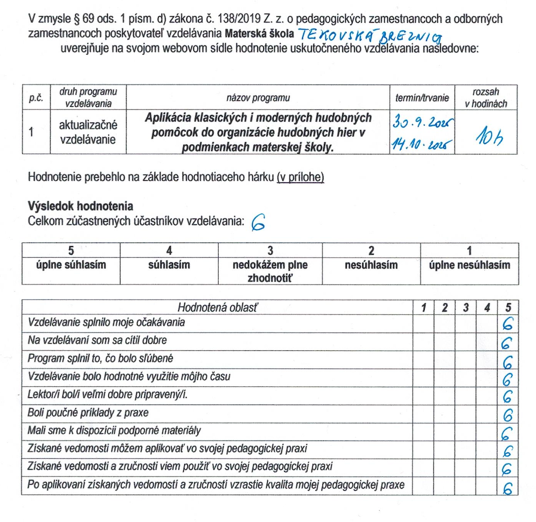 Hodnotenie aktualizačného vzdelávania 2025/2026 MŠ